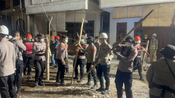 Personel TNI-Polri Berjibaku Bersihkan Puing Reruntuhan...